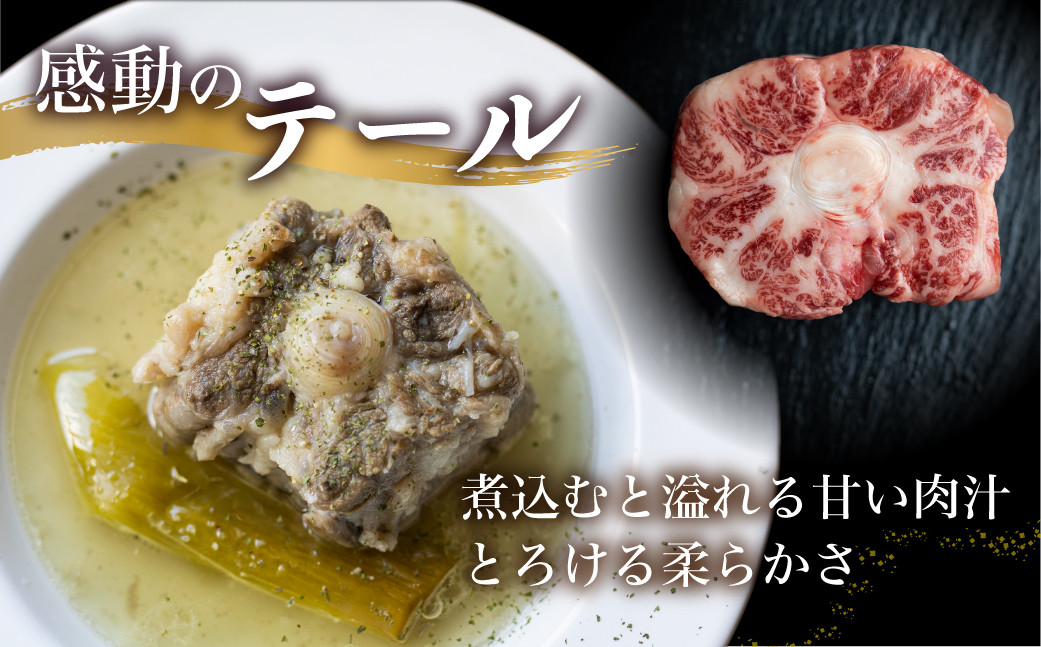 ロースから続くお肉ですのでサシが美しく入っており、煮込むと甘い肉汁ととろけてしまう程の柔らかさをお楽しみいただける”感動のテール”です。