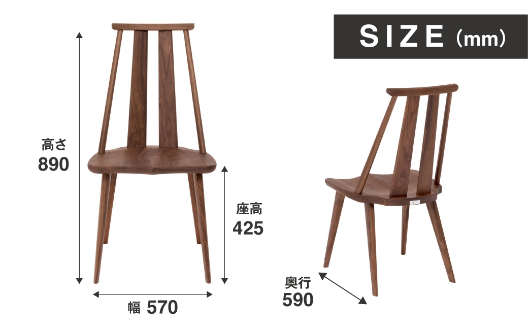 | 容量 | ダイニングチェア1脚 オーク+Bウォールナット材 幅:570 奥行:590 高さ:890 座高 / 肘高:425/600 |