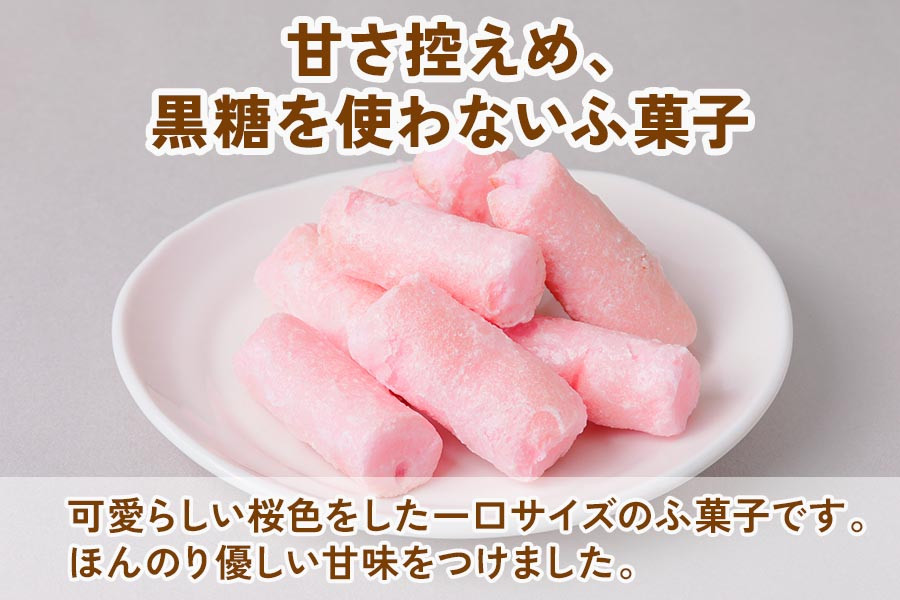 可愛らしい桜色をした、食べやすい一口サイズのふ菓子です。
