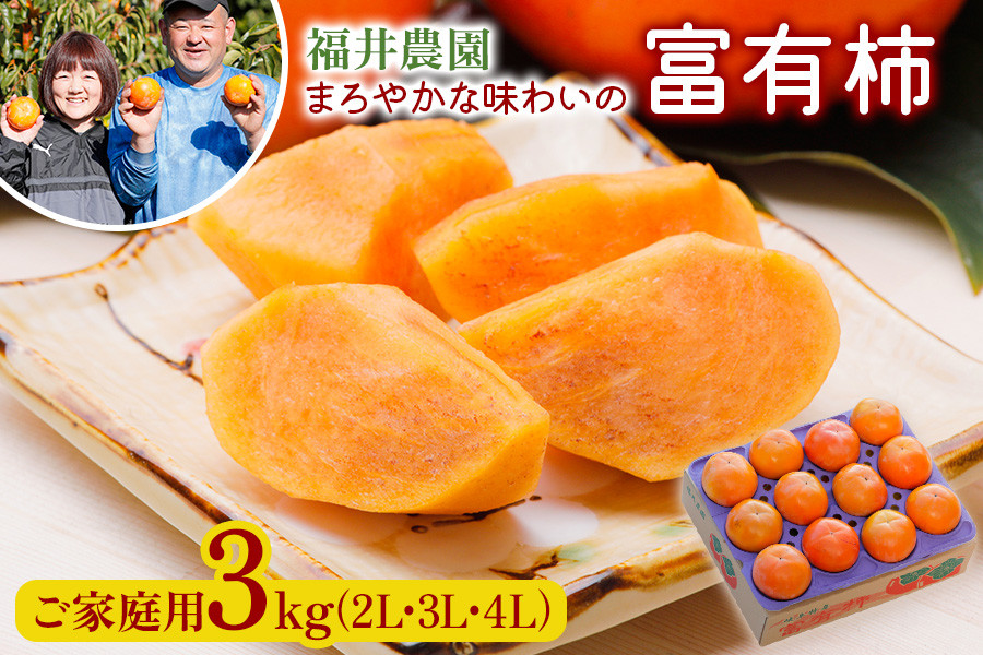 《柿の王様》【先行予約】令和7年産 福井農園の富有柿 ご家庭用 3kg (10~12個入) 2L、3L、4Lサイズ [11月~12月に発送予定] 有機質の多い独自肥料で栽培、まろやかな味わいの富有柿 [mt238]