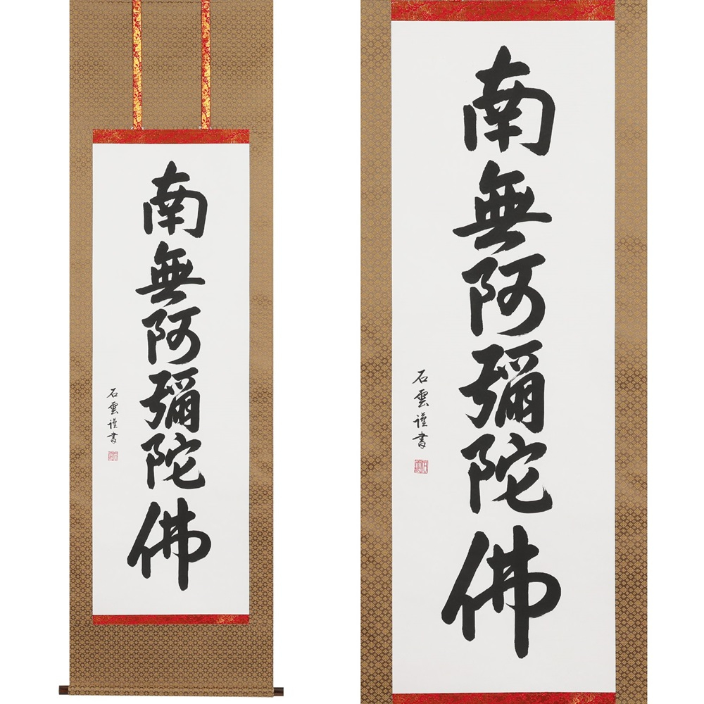掛け軸「六字名号」石雲 尺五立 掛軸 仏具 [1199]75,000 円 《「掛け軸」日本の伝統美》 掛軸を「掛けて拝する」日々、手をあわせて。 《ひとつひとつ手作業で仕立て上げる表具》 歴史ある匠の技から織りなす美しき表装。 何層も重なる反物は伝統と歴史も重ねあわせて。 《掛け軸を祀る》 一点一画心を込めて表される掛字は圧巻の風格。 《細部までこだわる》 掛緒から軸先まで、心を込めて。 《桐箱に収納》 掛軸は悠久の芸術。 大切な掛け軸を美しく保管。 作家:石雲(せきうん) 書道家 【注意事項】 ※1点1点手作りのため、本紙・裂地の色合いが変わる場合があります。 ■提供事業者:株式会社偕拓堂アート - 常温便