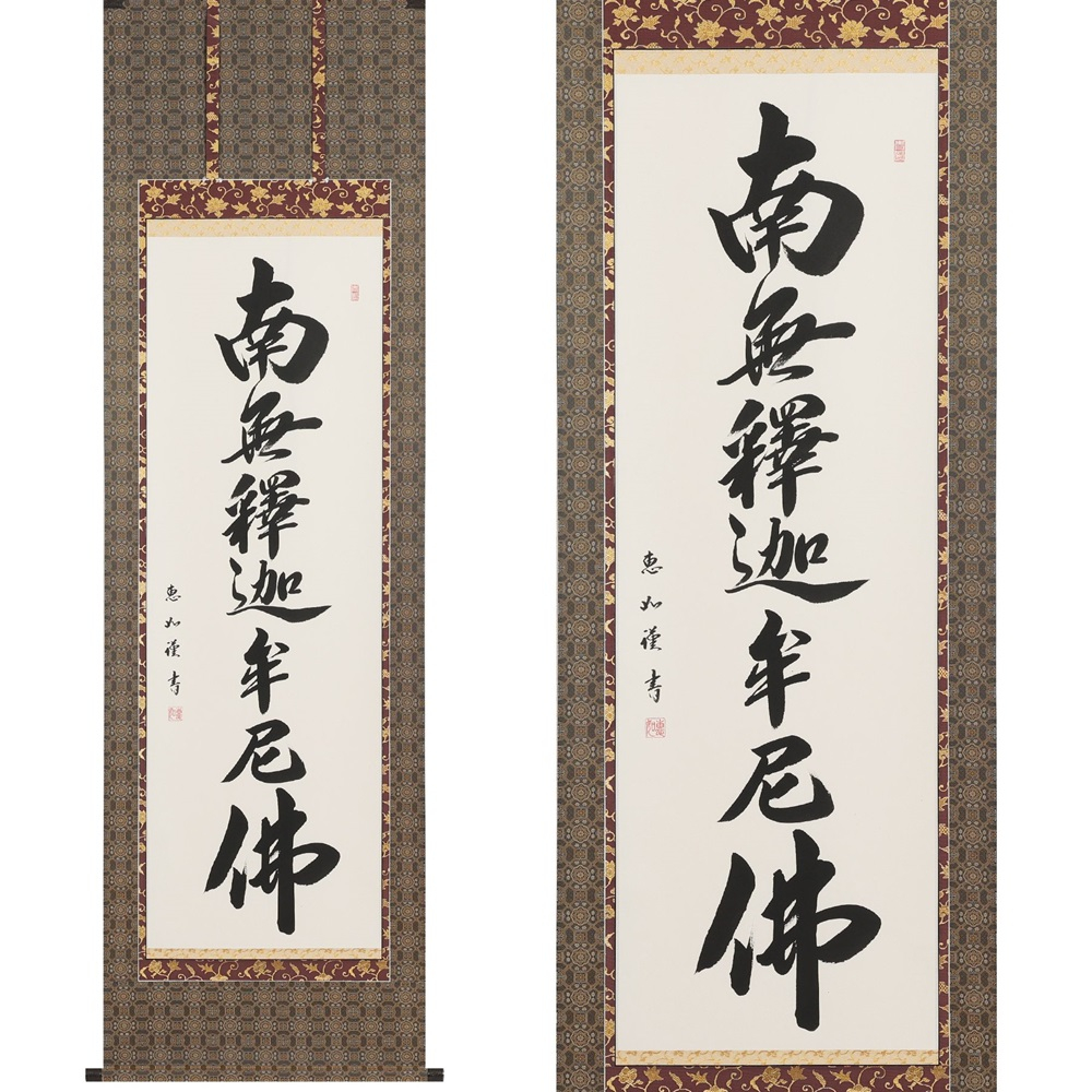 《「掛け軸」日本の伝統美》 掛軸を「掛けて拝する」日々、手をあわせて。 《ひとつひとつ手作業で仕立て上げる表具》 歴史ある匠の技から織りなす美しき表装。 何層も重なる反物は伝統と歴史も重ねあわせて。 《掛け軸を祀る》 一点一画心を込めて表される掛字は圧巻の風格。 《細部までこだわる》 掛緒から軸先まで、心を込めて。 《桐箱に収納》 掛軸は悠久の芸術。 大切な掛け軸を美しく保管。 作家:沙門玄香(さもん げんか) 臨済宗清聚院住職 【注意事項】 ※1点1点手作りのため、本紙・裂地の色合いが変わる場合があります。 ■提供事業者:株式会社偕拓堂アート