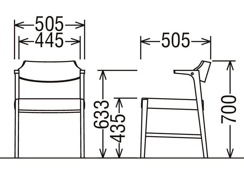 テーブルとの立ち座りが邪魔にならずに、食事後のくつろぎに肘を「ちょっと」掛けることができる便利なサイズ性は、薄く仕上げた積層曲木の背モタレと、相性の良いデザインです。