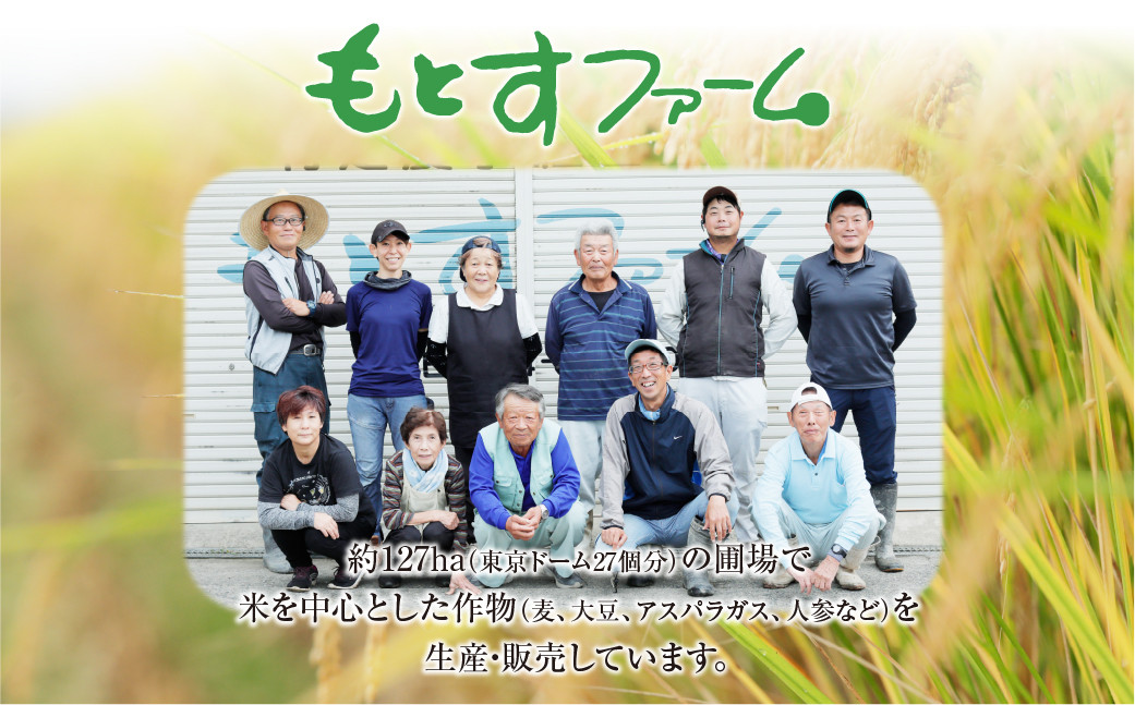 もとすファームは本巣地域の農業の担い手として1999年から活動しており、現在は約127ha (東京ドーム27個分) の圃場で米を中心とした作物 (麦、大豆、アスパラガス、人参など) を生産・販売しています。
