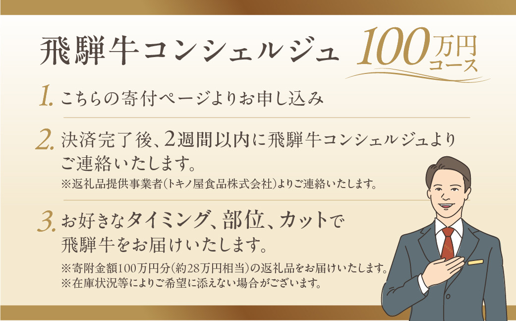 チョイス限定 飛騨牛コンシェルジュがあなたの為に飛騨牛をお届け。 [A5等級] 飛騨牛コンシェルジュ 100万円コース 飛騨牛 焼肉 やきにく ヤキニク ステーキ すき焼き しゃぶしゃぶ 高級 肉 牛肉 和牛 黒毛和牛 霜降り 赤身 ギフト 贈答 熨斗 お歳暮 正月 プレゼント トキノ屋食品 本巣市 [mt1821] 100万円 1,000,000円