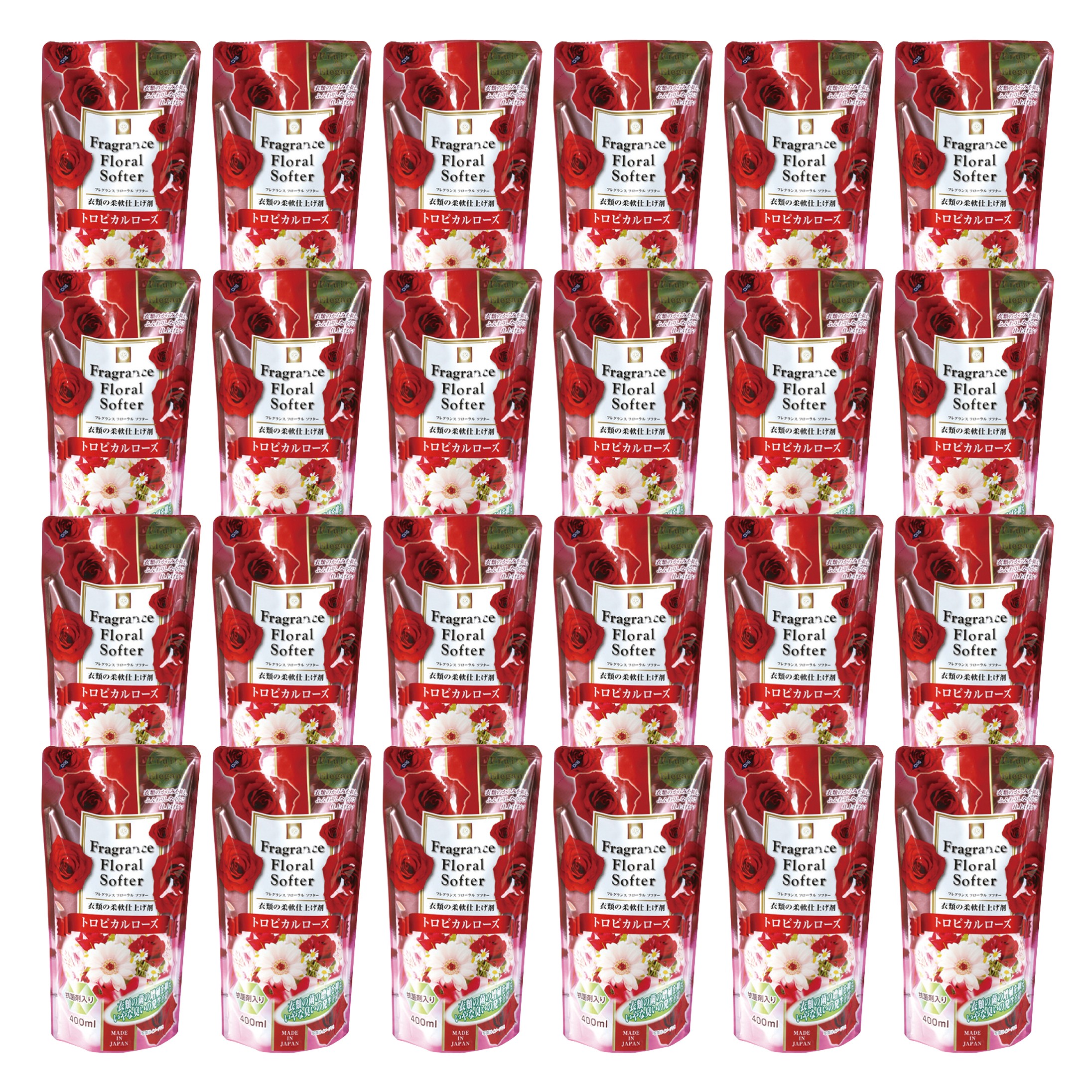 「衣料用液体柔軟剤のフレグランスフローラルソフタートロピカルローズ400ml詰替を24個」のセットです。