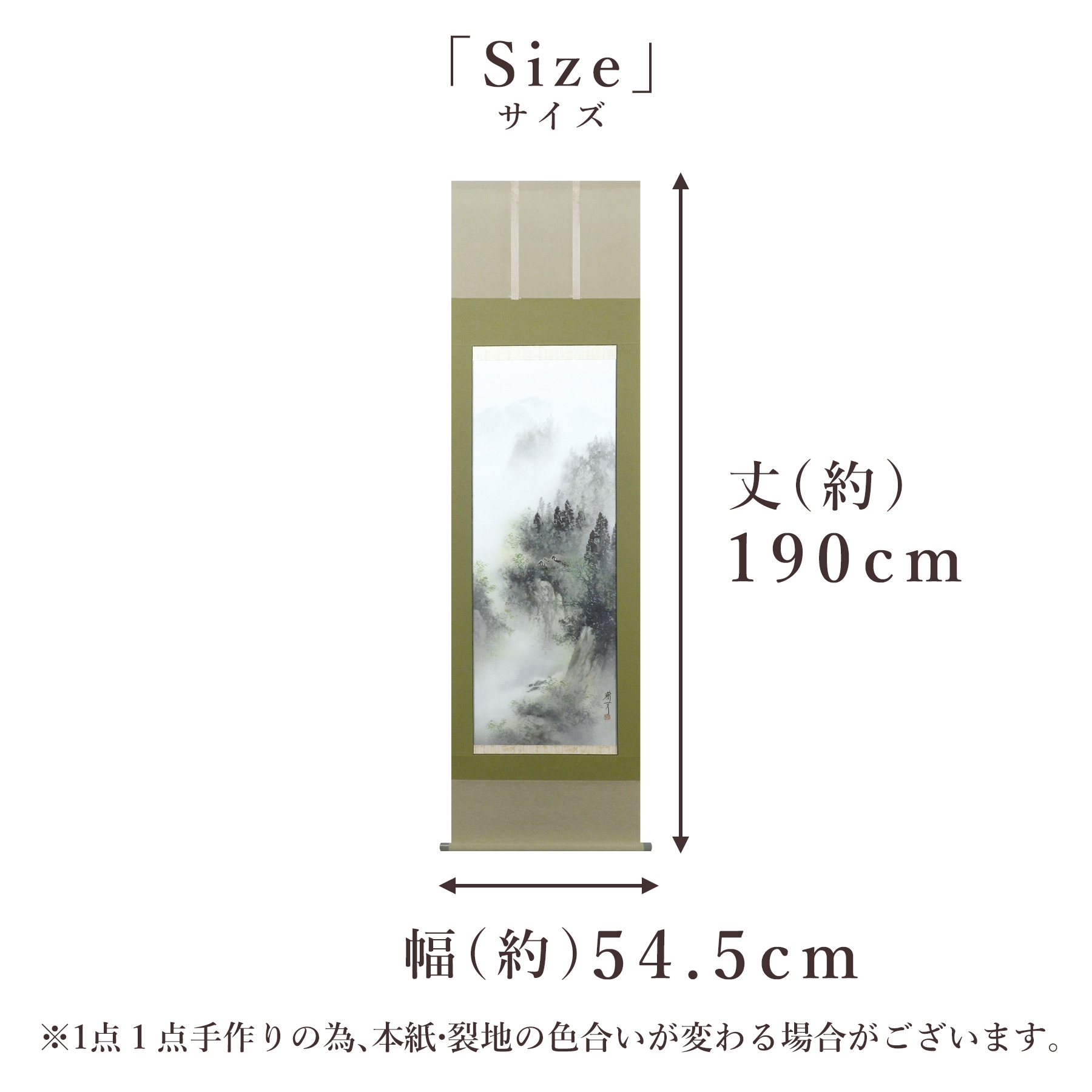 | 容量 | 掛け軸「彩色山水」 中沢樹芳 尺五立 サイズ:54.5×190cm 桐箱付 |