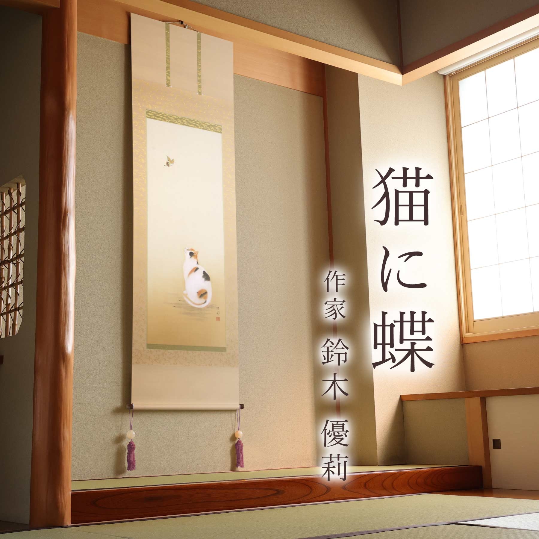 | 容量 | 掛け軸「猫に蝶」 鈴木優莉 尺五立 サイズ:54.5×190cm 桐箱付 |