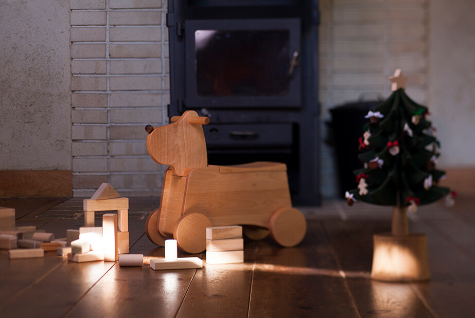 背中に乗って一緒に散歩したり、座面がおもちゃ箱のふたになっているので、お気に入りのおもちゃや積み木やぬいぐるみを入れることもできます。