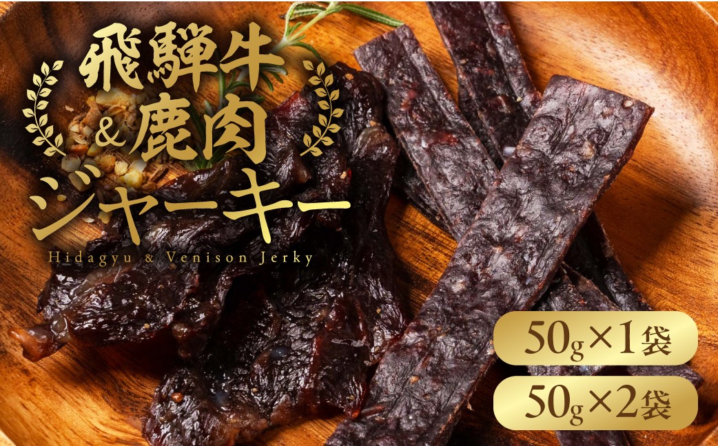 郡上市内で捕れたジビエ肉(鹿肉)と岐阜県産飛騨牛のジャーキーのセットです。