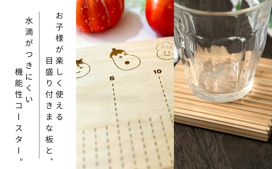 『はじめてのお料理お手伝い』をテーマに制作したまな板と、岐阜県の木材を使用したコースター(4枚)のセットです。