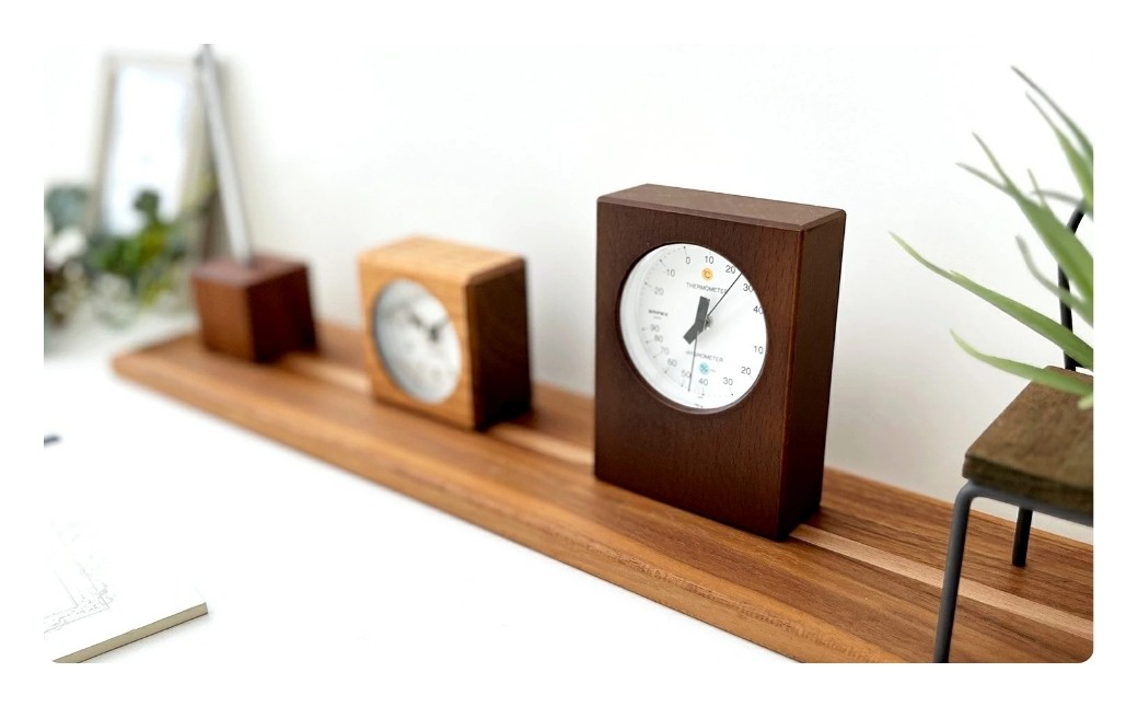 無垢材をくり抜いたて製造されたシンプルデザインの湿温度計。