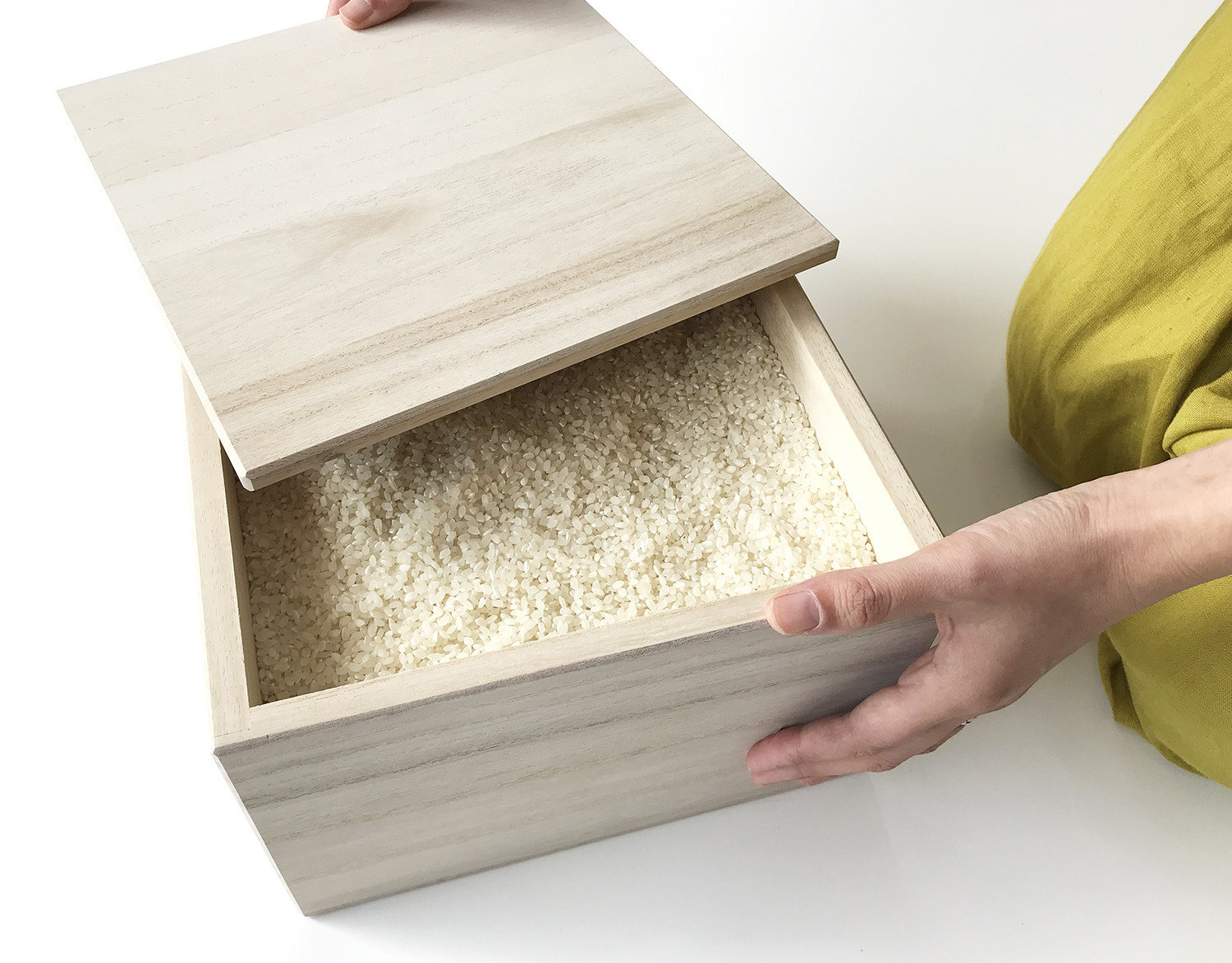 素材で使用している桐の機能性はそのままに、あまり古風なイメージにならないよう、一見して米びつとは感じさせないよう、キッチンにインテリアとしてさり気なく溶け込むようスタイリッシュな米びつを製作しました。
