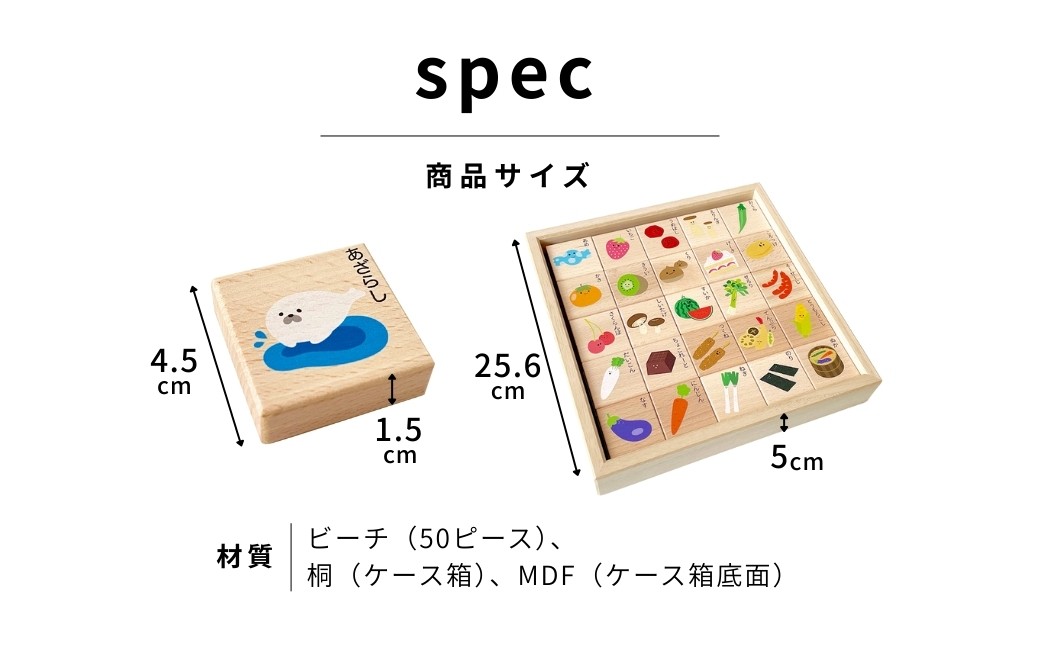 | 容量 | 【容量】 KATOMOKU あいうえお積み木 いきもの編 km-140 KATOMOKU あいうえお積み木 たべもの編 km-117 (付属品:収納木箱) 【サイズ】 45×45×15mm(1ピースサイズ) 256×256×50mm(桐箱サイズ) 重量 1435g(収納木箱含む総重量) 【材質】 ビーチ(50ピース)、桐(収納木箱)、MDF(収納木箱底板) 【備考】 対象年齢:3歳以上 |