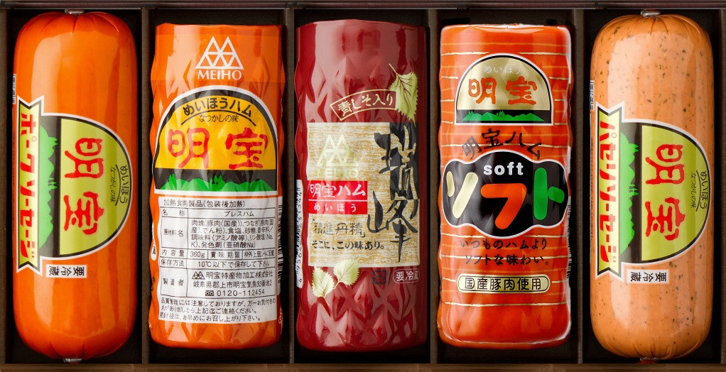 人気No.1のロングセラー商品「明宝ハム」と、明宝ハムのおいしさの特徴をそのままに、柔らかい食感に仕上げた「明宝ハムソフト」、明宝ハムを基本に、青じそとガーリックで風味をつけた「瑞峰(ずいほう)」、食感がたまらない「ポークソーセージ」、ソーセージの中にパセリを入れ風味豊かに仕上げた「パセリソーセージ」の5本セットです。