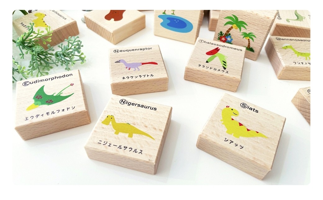 恐竜のイラストが描かれたアルファベットの文字積み木