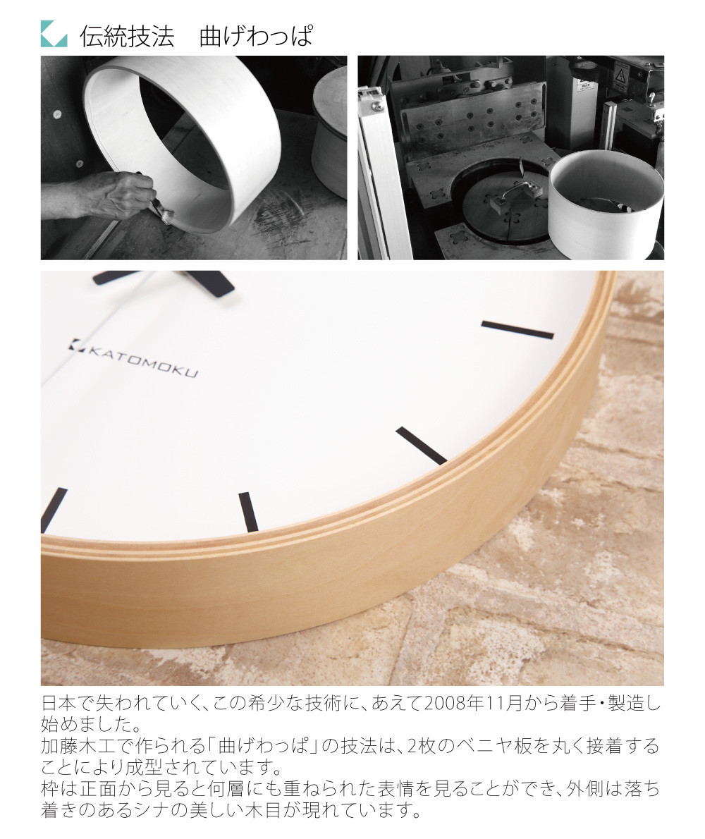 日本の伝統工芸「曲げわっぱ」の技法を掛け時計に取り入れ、シンプルで見やすいデザインにしてみました。