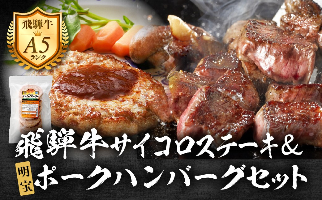 飛騨牛A5等級肉のサイコロステーキと、オリジナル明宝ポークハンバーグセット。
