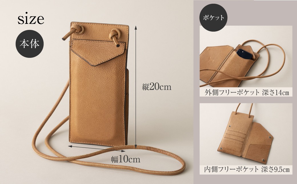 郡上市で捕獲された野生鹿革を使った首掛けタイプのスマホショルダーバッグ