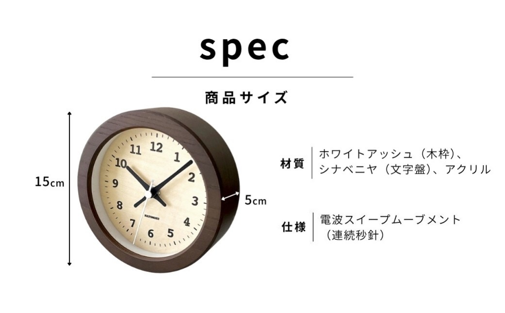 | 容量 | dual use clock 7 電波時計 (付属品:取扱説明書、保証書、単3電池、壁掛け用木ネジ) サイズ:Φ150×50mm 重量:300g 材質:ホワイトアッシュ(木枠)、シナベニヤ(文字盤)、アクリル 仕様:電波スイープムーブメント(連続秒針) 色:ナチュラル、ブラウン ※色をお選びください。 |