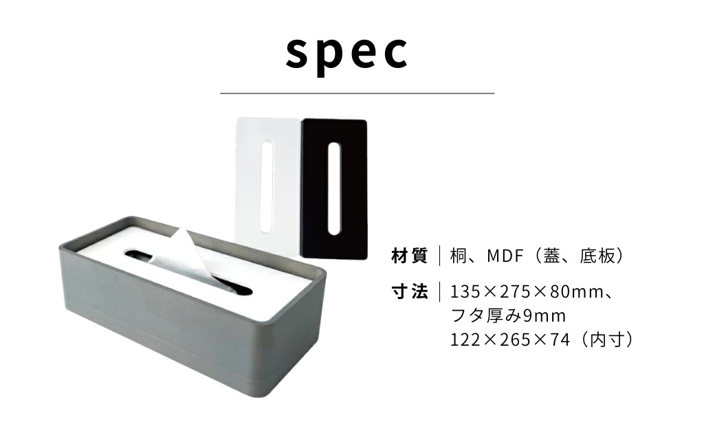 | 容量 | 容量 KATOMOKU ティッシュケース(リバーシブル) 【サイズ】 135×275×80mm、フタ厚み9mm 122×265×74(内寸) 【材質】 桐、MDF(蓋、底板) 【事業者】 加藤木工株式会社 【備考】 ホワイト/ブラック:ホワイト/ブラック(蓋)、グレー(本体) ライトブルー/ライトグリーン:ライトブルー/ライトグリーン(蓋)、グレー(本体) ※蓋がリバーシブル仕様です。 |