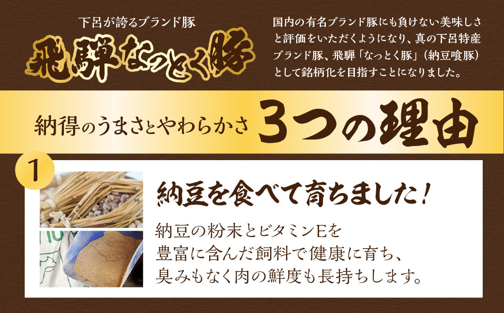 南飛騨の大自然に囲まれた環境の中で育てられた「納豆喰豚」は飼料に納豆の粉末を食べさせていることから「納豆喰豚(なっとくとん)」と名付けています。