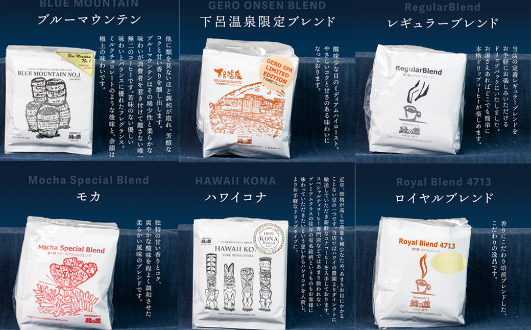 | 容量 | ブルーマウンテンNo1 5杯×1 ハワイ・コナ 5杯×1 ロイヤルブレンド 5杯×1 レギュラーブレンド 5杯×2 下呂温泉ブレンド 5杯×1 モカ・スペシャルブレンド 5杯×1 (※計35杯分) |