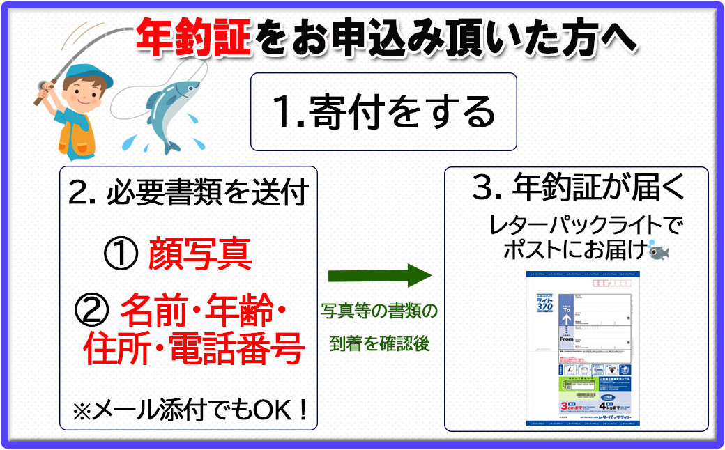 【寄附および写真等の書類到着を確認した後、馬瀬川上流漁業協同組合の「鮎年釣証」をレターパックライトにてお送りします。