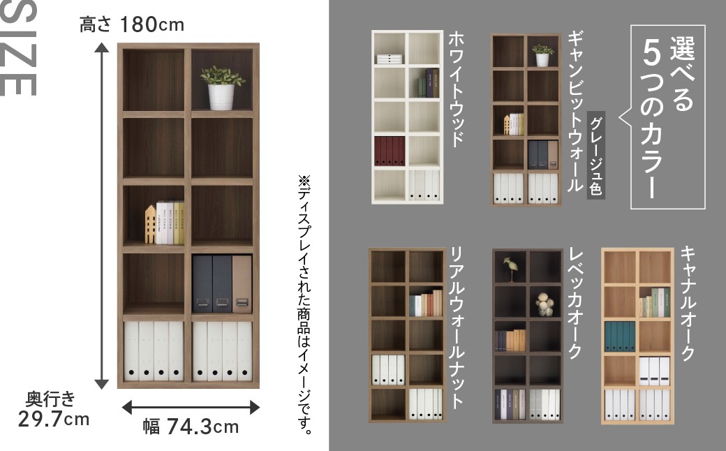 | 容量 | サイズ: W743 D297 H 1800mm 材質: プリント化粧板 付属品: ●棚板6枚 ●固定金具 棚板耐荷重 20kg |