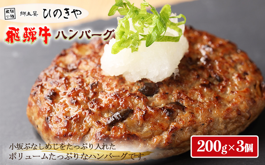 【地域限定】飛騨牛と飛騨豚の合いびき肉に、小坂ぶなしめじを入れたボリュームたっぷり、一人前200g×3個のハンバーグです。