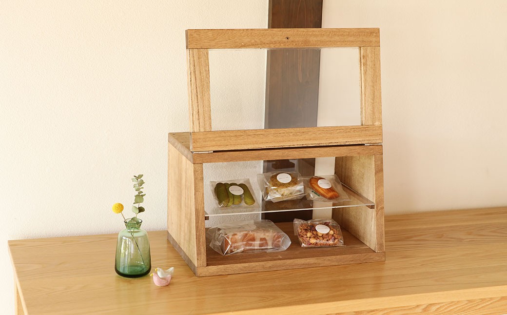 こだわりの天然素材で時間をかけて丁寧に作り上げた、暖かみのある手作り家具 ショーケース(高さ25㎝ 幅40㎝ 奥行29㎝)下呂市 木製 1点もの ナチュラル オリジナル シンプル 小物入れ 収納 マルシェ キッチン スパイスラック 調味料ラック カウンター上収納