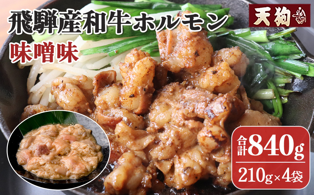 飛騨牛・飛騨和牛の新鮮な白モツに当店特製のみそタレで味付けました。 飛騨産和牛ホルモン 味噌味 210g×4袋 【冷凍】牛肉 牛ホルモン みそ味 天狗 ほるもん 牛ホル