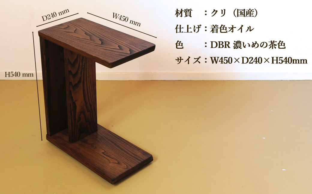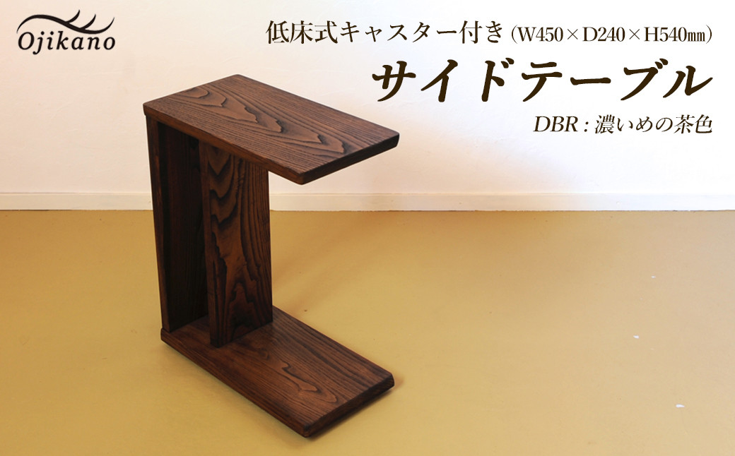 【便利なキャスター付で移動自在】木目の美しさが際立つシンプルなサイドテーブル 【DBR 濃いめの茶色】サイドテーブル 【低床式キャスター付き】 高さ540mm(54cm)【国産クリ使用・着色オイル仕上げ】(ダークブラウン) 【大鹿野工房】