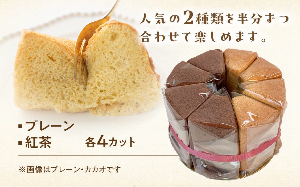 プレーン&農薬を使わない紅茶を使用したふわっふわのシフォンケーキ シフォンケーキ(プレーン&有機紅茶)2種アソート(ハーフ&ハーフ)1ホール分(各4カット)( 1カット15g)計 120g シフォンケーキ 紅茶 シフォン 手作り こだわり おすすめ 馬瀬 下呂市 洋菓子 ケーキ カット済み 個包装