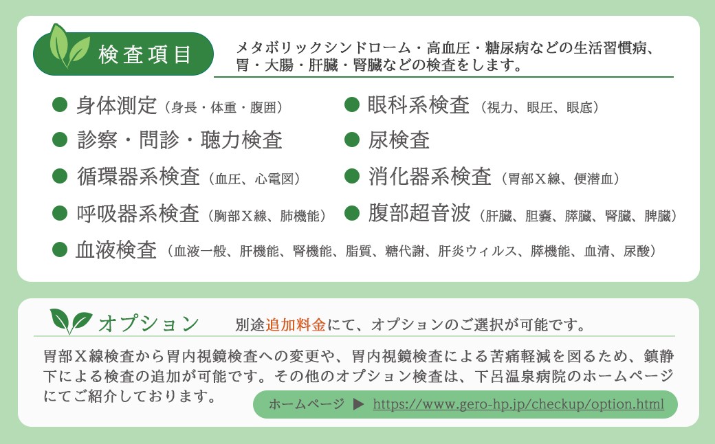 | 容量 | 基本ドック(スタンダード)利用券(1名様分)・健診案内 (スタンダードなドックコース) 【検査内容】 ・身体測定(身長・体重・腹囲) ・診察・問診 ・聴力検査 ・循環器系検査(血圧、心電図) ・呼吸器系検査(胸部X線、肺機能) ・眼科系検査(視力、眼圧、眼底) ・尿検査 ・血液検査(血液一般、肝機能、腎機能、脂質、糖代謝、肝炎ウィルス、膵機能、血清、尿酸) ・消化器系検査(胃部X線、便潜血) ・腹部超音波(肝臓、胆嚢、膵臓、腎臓、脾臓) その他オプションも充実しております。 【オプション検査】 ※オプションはこちらの返礼品のコースには含まれません。 別途費用が必要となりますので予めご了承ください。 胃部X線検査を胃内視鏡検査に変更可 胃内視鏡検査による苦痛軽減を図るため、鎮静下による検査を追加可能 その他のオプション検査はHPをご確認ください。 https://www.gero-hp.jp/checkup/option.html ********************************** 下呂温泉宿泊クーポン券(10,000円分)1枚 ※使用可能な宿泊施設一覧(2025年9月現在) 1.湯之島館/2.水明館/3.望川館/4.下呂観光ホテル/5.下呂温泉山形屋/6.小川屋/7.下呂ロイヤルホテル雅亭/8.川上屋花水亭/9.菊半旅館/10.紗々羅/11.ホテルくさかべアルメリア/12.吉泉館竹翠亭/13.懐石宿 水鳳園/14.大江戸温泉物語Premium 下呂本館/15.大江戸温泉物語 下呂別館/16.こころをなでる静寂 みやこ/17.木曽屋/18.冨岳/19.睦館/20.観光ホテル湯本館/21.みのり荘/22.旅館 瓢きん/23.紅葉館別館わん泊亭/24.いずみ荘/26.くつろぎの宿ふじはら/27.旅館 ますや/28.内湯 浅野屋/30.民宿 松園/31.温泉ビジネスホテル 富喜屋/32.幸乃湯旅館/33.温泉宿 廣司/34.ビジネスホテル プランタン/35.神明山荘/36.食堂・民宿 ラムネ屋/37.ゆらぎの里 ひだ山荘/38.桜リバーサイドステイ下呂温泉 |