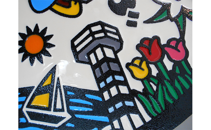 マンホールふたデザインコンテスト(平成30年度)の最優秀デザインに、職人が一つ一つ手作業で色を入れた海津市限定マンホール蓋です。マスコットキャラクター「かいづっち」を中心に、市の木(松)、市の花(みかん)、市の魚(なまず)や市内観光スポット(千代保稲荷神社・木曽三川公園・月見の森)が描かれています。