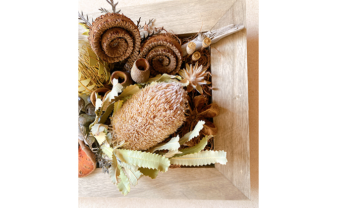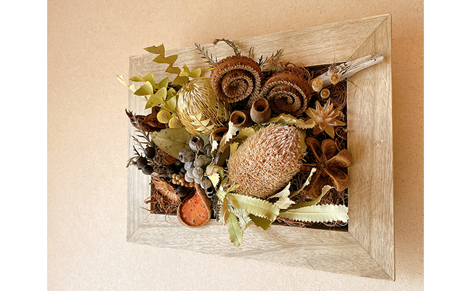 大人気のワイルドフラワー(バンクシア等)を中心に、立体的にアレンジしているためダイナミックな仕上がりです。植物そのもののたくましさや魅力を生かし、丁寧に制作しています。