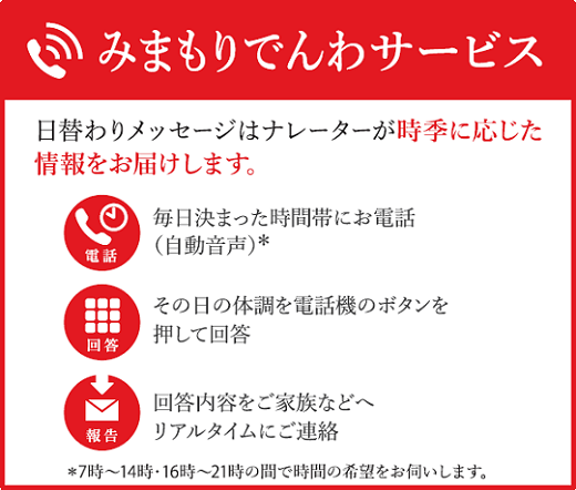 ふるさと笠松町で暮らす親御さんに、毎日お電話(自動音声)で体調確認を行い、その結果をご家族様へお知らせするサービスです。