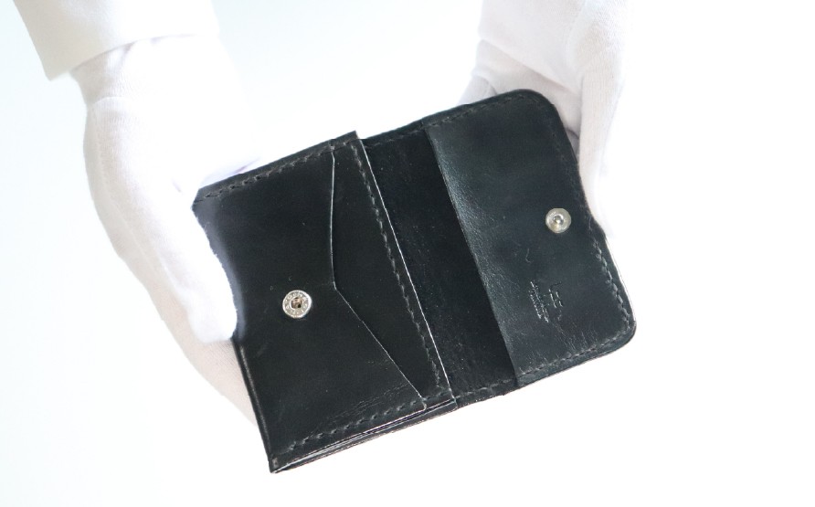 | 容量 | ■サイズ:タテ約7.3㎝ ヨコ約10.7㎝ 厚み約1.8㎝ ■素材:(外側)牛ヌメ革【黒色染色】 (内側)豚革スウェード ■ポケット×2(名刺約25枚収納可能) |