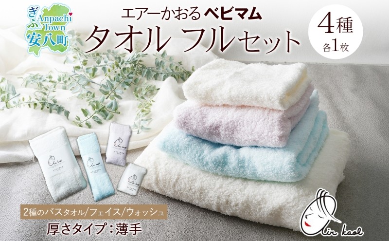 [№5331-0165] エアーかおる ベビマム タオル4種セット 各1枚 計4枚 バスタオル フェイスタオル ウォッシュタオル バス タオル 半分時代 日本製 綿100% 柔らか 軽い スーパーZERO 吸水速乾 デリケート肌 敏感肌 赤ちゃん おくるみ 送料無料 浅野撚糸 岐阜県 安八町