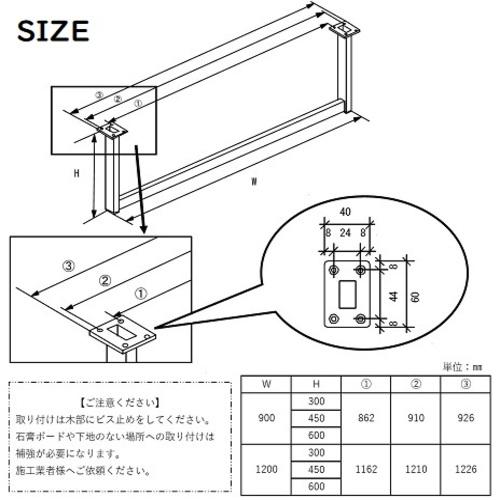 | 容量 | [サイズ] W1200×H600:設置サイズ:幅122.6×高さ65×奥行6cm 重 量:2.2kg W1200梱包サイズ:121×11×8 cm 耐 荷 重:10 kg [材質] スチール [色] サテンブラック ※粉体塗装 マットな質感が美しいパウターコーティング [組み立て] 必要・ドライバー ・天井裏が確認できる高さまで上がれる脚立などをご用意ください。 付属品 :ハンガーパイプ固定用ネジ:皿小ネジ M5*10 2本 :天井取り付け用ネジ :タッピングネジ M4*40 9本 [設置について] ●天井専用のハンガーバーです。壁面や傾斜天井には取り付けできません。 ●取り付け前にまずコの字型に組み立てておいてください。 ●取り付けは木部にネジ止めしてください。 付属ネジ:タッピングネジM4*40mm 9本(内1本は予備) ●下地の無い場所や石膏ボードへの取り付けは補強が必要になります。施工業者様へご依頼ください。 [確認事項] ●事前確認 ・天井に下地処理が施してあるかを確認してください。 ・電気配線その他配管等に障らないことを確認してください。 ●取り付け時の注意 ・十分な下地の無い天井には取り付けできません。 ・施工業者様による取り付けを推奨する商品です。 ・お2人での作業をお願いします。 ・付属の木ネジを使えない場合は、合うものをご用意ください。 ・取り付けが不十分な場合、ハンギングした際に落下の危険があります。 ●使用時の注意 ・つかまったりぶら下がったりすると商品の破損、ケガの恐れがありますのでおやめください。 ・荷重が1点に集中しないようにご注意ください。耐荷重の目安は10kgです。範囲内でご使用ください。 ・定期的にネジの緩みやがたつきが無いか確認してください。 ・屋内でご使用ください。錆の発生により劣化しやすくなりますので、屋外への設置はお控えください。 ・ハンガーが当たる部分は、場合により塗装の擦れや剥がれが生じてきます。気になる場合は市販のキズ防止テープ等で保護してお使いください。 |