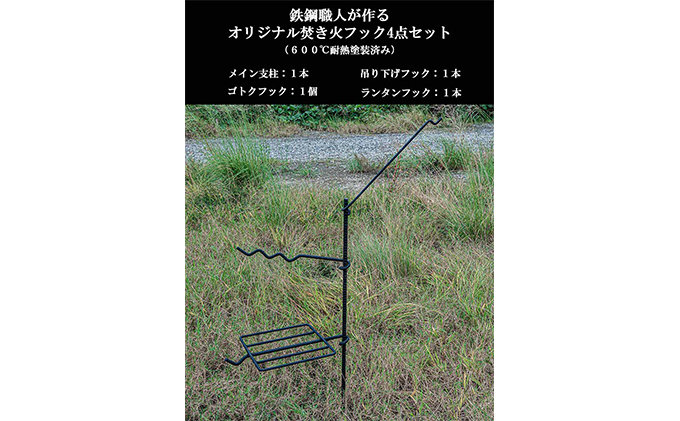 岐阜のアウトドアガレージブランド「無敵SURVIVEGEAR」より色々な焚き火台に使える男前で無骨な焚き火フックの4点セットになります。