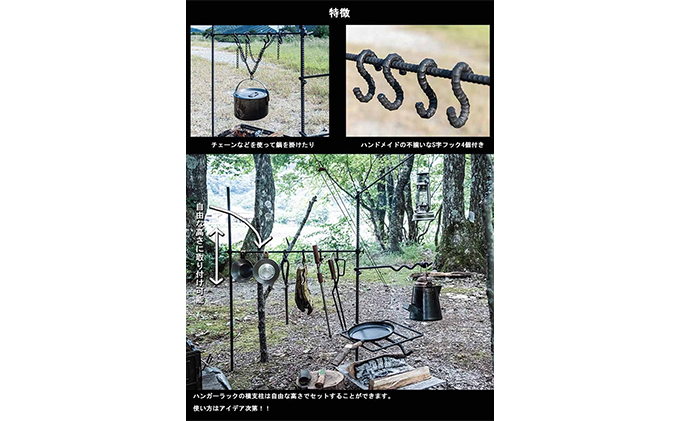 ゴトクフックには鉄板をのせたりやかんをのせたり、コッフェルや鍋、ダッチオーブンなどものせれます。また、自由な高さに取り付け可能なハンガーラックには便利なS字フック4個付き。焚き火道具を吊るしたり、お手持ちのチェーンなどを使って鍋を掛けたりと、焚き火料理がとてもやり易くなります。