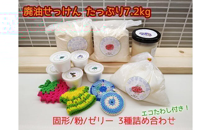 飲食店で使い終わったてんぷら油や廃棄対象となったご飯粒から作った、人と環境にやさしい無添加せっけんです。固形せっけん、粉せっけん、ゼリーせっけんの3種類の詰め合わせです。また、せっけんと一緒に使えるエコたわしも大小各2個ずつお届けします。