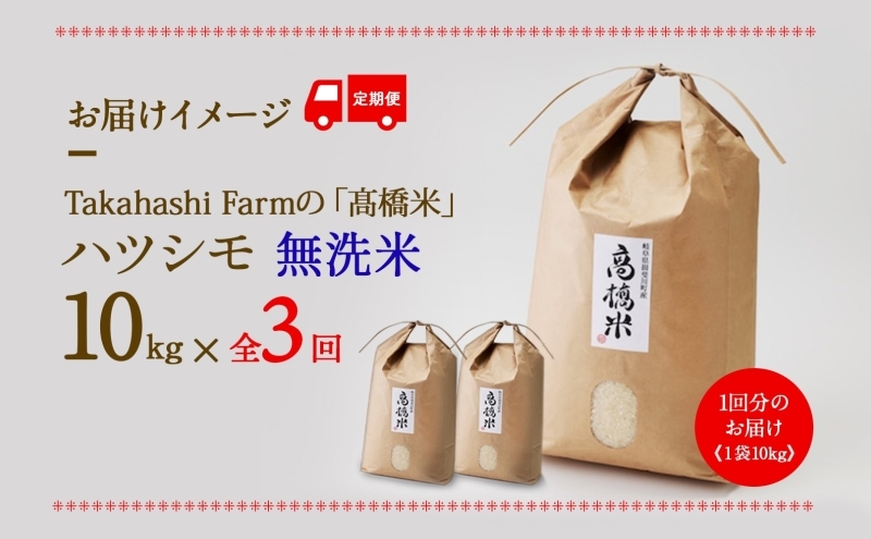 [№5568-0423]< R8年産 先行予約 >定期便 全3回 米 ハツシモ「高橋米」無洗米 10kg×1袋 令和8年産 10キロ お米 精米 白米 ご飯 はつしも ブランド米 大粒 炊飯 ふっくら お取り寄せ 送料無料 Takahashi Farm 岐阜県 揖斐川町