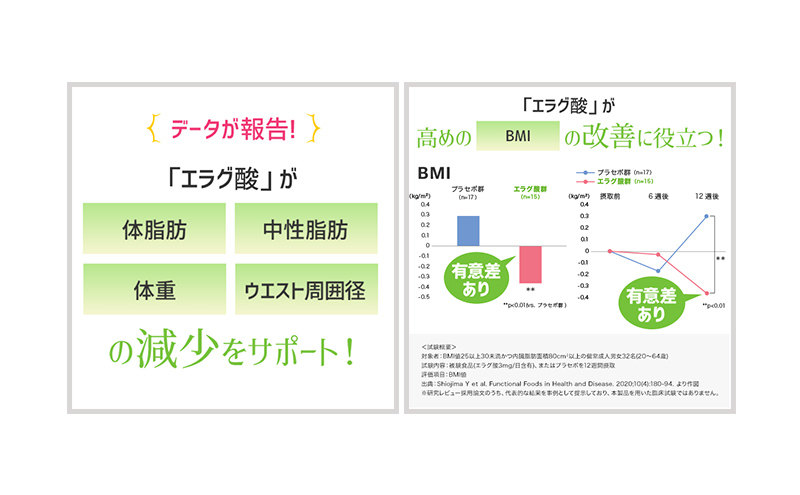 『ウエスト気になる』は、機能性関与成分エラグ酸を1日あたり3mg配合した機能性表示食品です。肥満気味の方の体脂肪、血中中性脂肪、体重、ウエスト周囲径の減少をサポートし、高めのBMI値の改善に役立つことが報告されています。