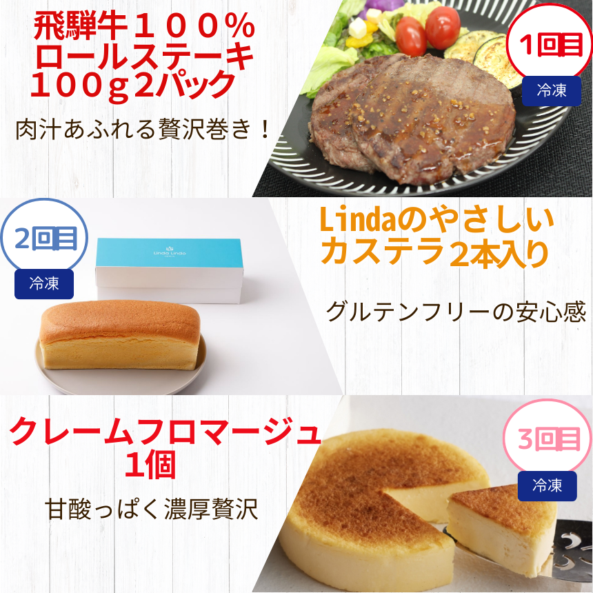 | 容量 | ご注文の翌月から月に1回ずつお届けします。 【1回目】 ・飛騨牛100%ロールステーキ 100g× 2パック 薄切りの飛騨牛を丁寧に重ね、ミルフィーユ状に巻き上げました。焼いてお召し上がりください。 【2回目】 ・Lindaのやさしいカステラ 350g×2本入り グルテンフリーで体にも心にもやさしいしっとりとしたカステラに仕上げました。 【3回目】 ・クレームフロマージュ 1個入り 濃厚なのに爽やかで口溶けがよく上品な甘さが人気、名店フランボワーズのチーズケーキです。 【4回目】 ・豚ヒレカツ(生パン粉付き) 6個入り 高級部位の柔らかヒレカツは衣付きなのでおうちで揚げたてサクサクを食べられます。 【5回目】 ・Lindaのアイスプリン 180g×2個入り パリパリ食感、キャラメリゼのアイスプリンは半解凍で食べるのがオススメです。 【6回目】 ・北方とうふ 10個入り 豆乳を使ったスポンジにそら豆餡、黒ごま餡、クリームチーズをサンドし豆腐に見立てたお菓子です。 |