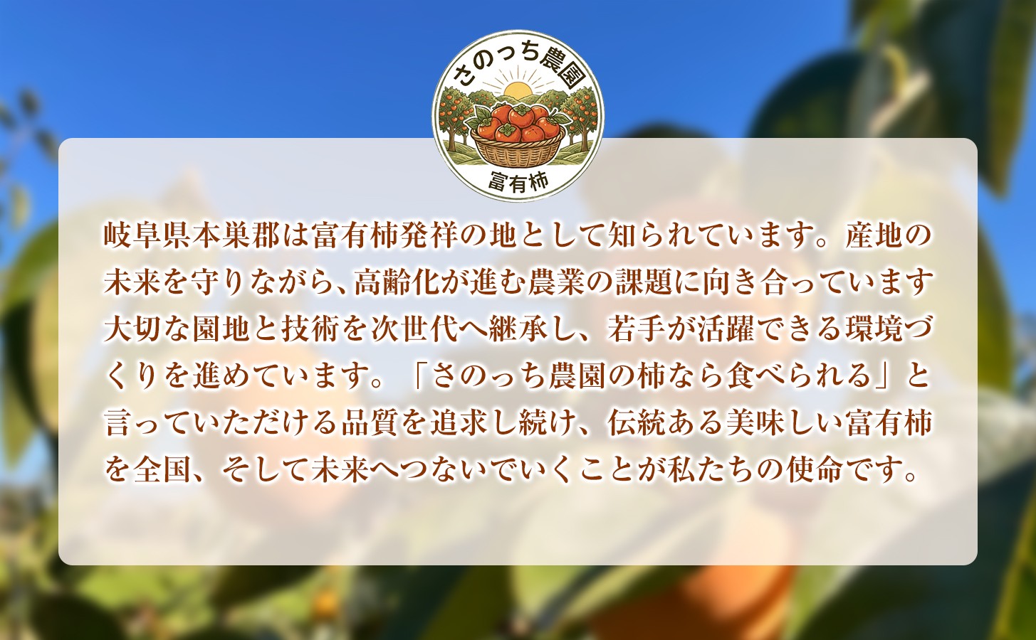 「この柿しか食べられない」と言っていただける品質を追求し続けています。産地の衰退を防ぎ、伝統ある富有柿を次世代へ繋ぐことが使命。感動の一玉を全国の皆様へお届けします。