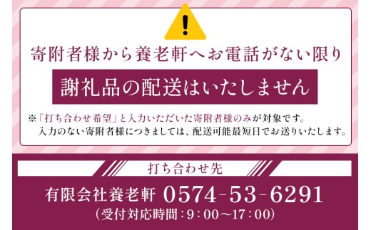 ■■■日時指定■■■ 日付:不可 時間:可 配送開始時期になりましたら、事業者から順次、冷蔵便で直送いたしますので、必ずお受け取り(※1)をお願いいたします。 (※「打ち合わせ希望(下記参照)」を入力された寄附者様につきましては、打ち合わせ後の配送) ▼皆様共通の注意事項 ・北海道、青森、秋田、九州(一部地域を除く)、沖縄、その他一部の地域へのお届けは発送日から翌々日での到着となります。そのため消費期限が謝礼品到着日となりますのでご注意下さい。 ・不在日や不在曜日等ございましたら、「申し込みに関する備考」欄にご入力をお願いいたします。 ・不在日等が多く、事業者様と直接配送日時を打ち合わせしたい寄附者様は「申し込みに関する備考」欄に【打ち合わせ希望(下記参照)】とご記載ください。 ・配送予定メール等の送信は、システムが未対応のためお送りいたしませんので、ご了承ください。 ▼「打ち合わせ希望」と入力された寄附者様 ご寄附いただいた翌日以降(翌日が土日祝日の場合、休日後の平日以降(※2))に事業者(養老軒)様へ直接お電話(※3)していただき、配送の打ち合わせをお願いいたします。 寄附者様からお電話があるまで謝礼品の配送は行いませんので、ご注意ください。 ※1 お受け取りができなかった場合の補償はできかねます。 ※2 例)土曜日寄附(月曜日が平日)→月曜日以降 土曜日寄附(月曜日が祝日)→火曜日以降 ※3 打ち合わせ先:有限会社養老軒 0574-53-6291(営業時間:9:00~19:00(日曜・祝日は18時閉店、水曜日定休)) ■■■発送事業者■■■ 有限会社 養老軒 |