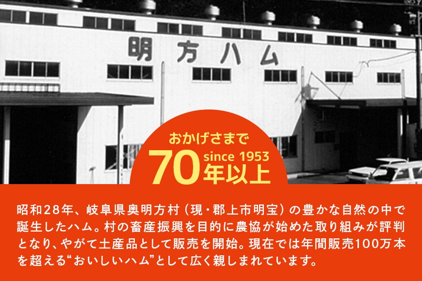 明方ハムは、めぐみの農業協同組合(JAめぐみの)が製造販売するJAブランドの高級プレスハムです。 明方ハムの誕生は、昭和28年、旧岐阜県郡上郡明方(みょうがた)村、「現在の郡上市明宝(めいほう)」で、村の畜産振興と山間地の食生活改善を目的に農協が作り始めました。